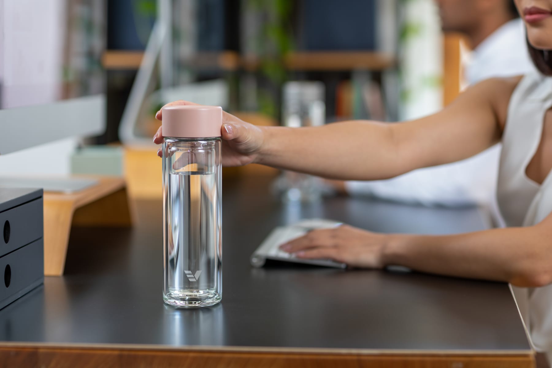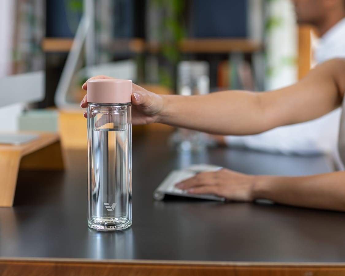 A female grabbing her Ever Vessel Glass Multi double walled glass tea infuser bottle with the white lid off her desk.